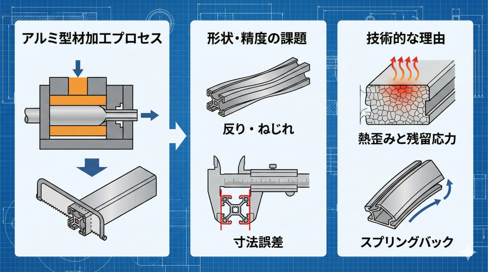 アルミ型材加工で生じる寸法誤差や真直度不良、反り・ねじれといった問題は、単なる「加工不良」だけが原因ではありません。アルミ材質そのものの機械的特性、押出金型の設計思想、切削工程でのクランプ方法や熱変形など、いくつかの技術的要因が重なって起こります。ここでは、形状や精度の課題がなぜ起こるのかを技術的に整理し、外注先と共通認識を持つための基礎知識を解説します。